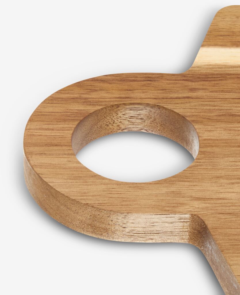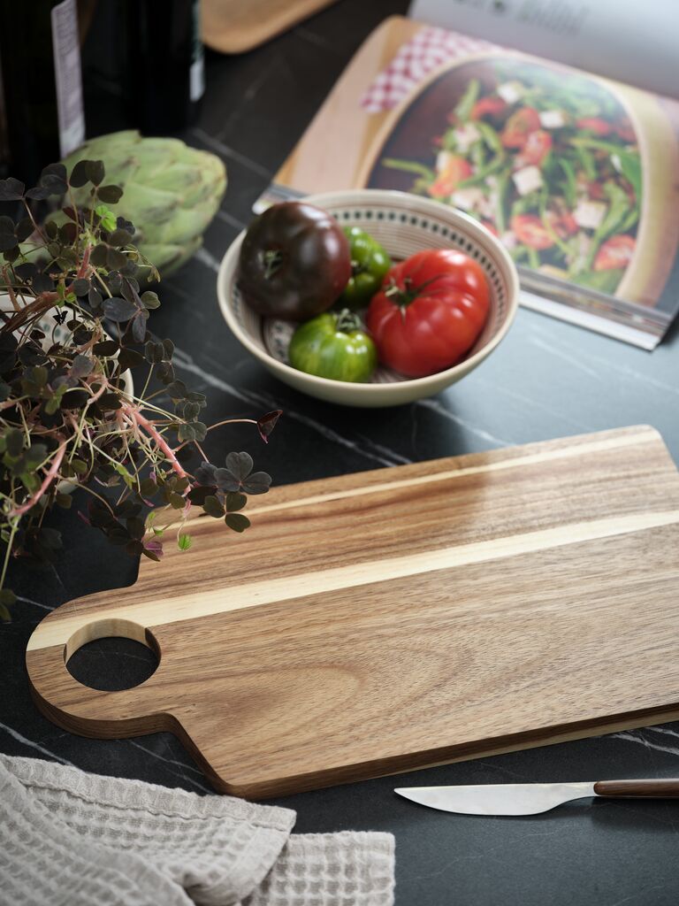 Planche à découper en bois d'acacia résistant pour toutes les tâches de cuisine. Dispose d'une poignée ronde pratique pour une utilisation et un rangement faciles. Idéale pour hacher, trancher et servir. l20 x L38 x H1,5 cm