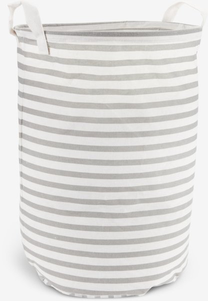 Panier à linge avec des rayures grises et blanches et des poignées. Fabriqué à partir d'un mélange fonctionnel de polyester et de polypropylène. Ø36 x H50 cm