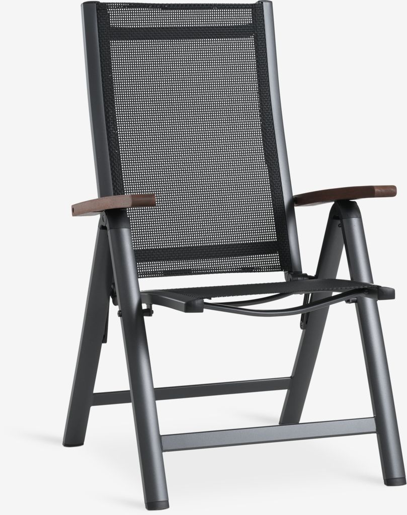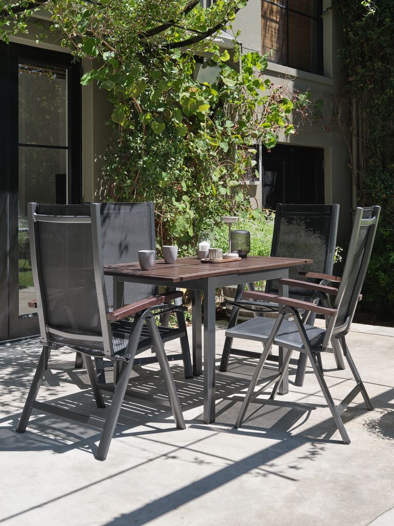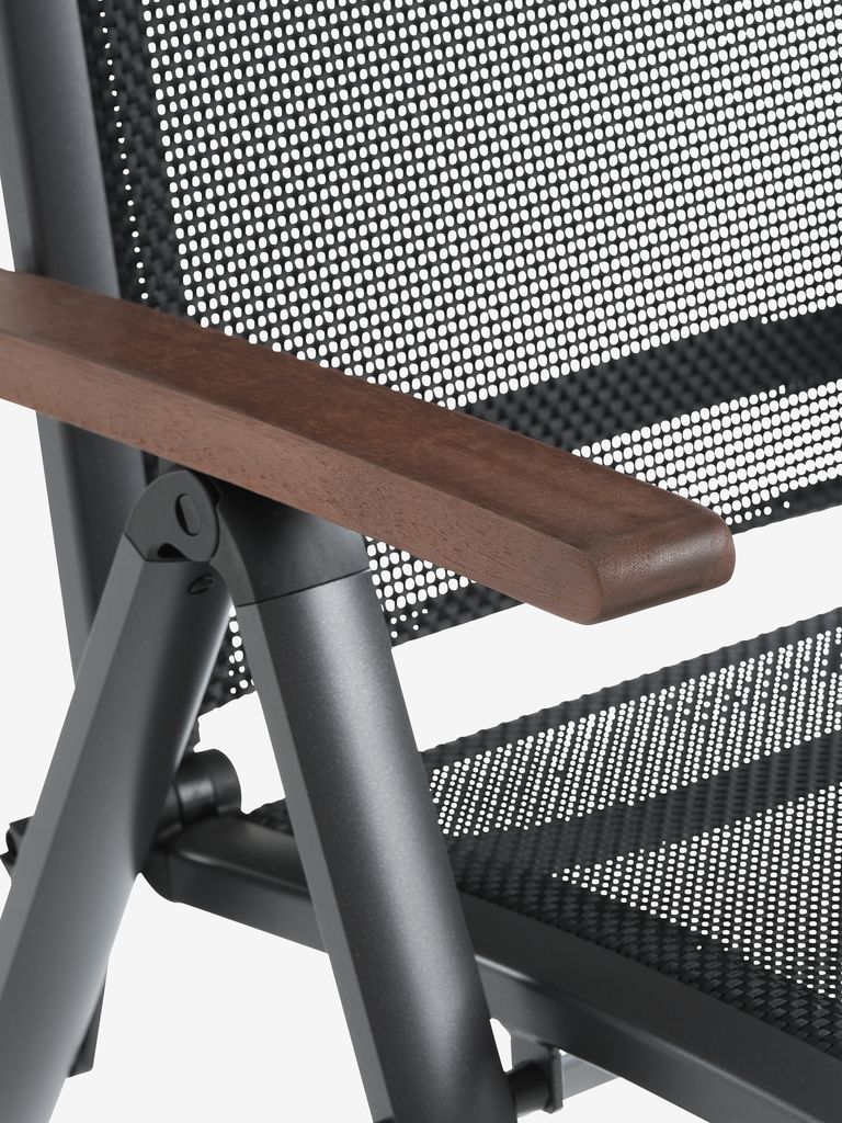 Chaise inclinable grise avec assise et dossier en textilène et structure en aluminium. Accoudoirs en bois dur FSC® huilé pour un aspect élégant. Le dossier peut être incliné en 6 positions. Le textilène est un matériau confortable, dont les couleurs sont inaltérables, qui sèche rapidement et se nettoie facilement. L'aluminium est un matériau léger et robuste qui ne rouille pas. Le bois durable est traité à l'huile pour le protéger et rehausser sa couleur naturelle. Il est recommandé d'huiler régulièrement le bois pour maintenir sa couleur et le protéger de l'humidité. La chaise de jardin peut être pliée à plat, ce qui la rend facile à transporter et à ranger.