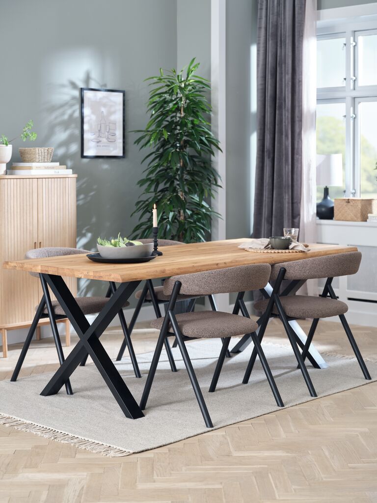Tafel: Massief eiken en staal. Excl. verlengbladen. B95 x L200 x H75 cm. Stoel: Stof en staal.