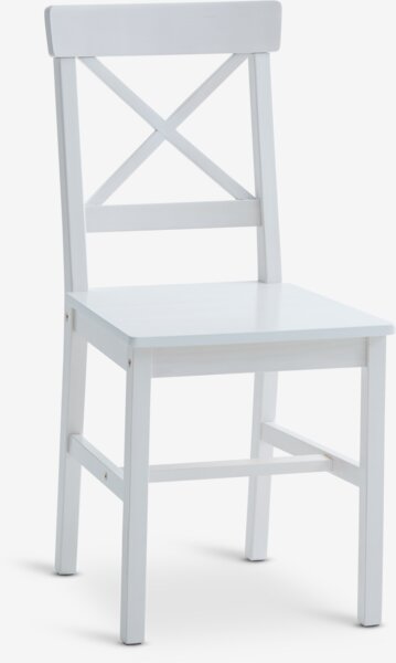 Eetkamerstoel van wit massief grenen en MDF. De stoel is gelakt voor extra duurzaamheid.