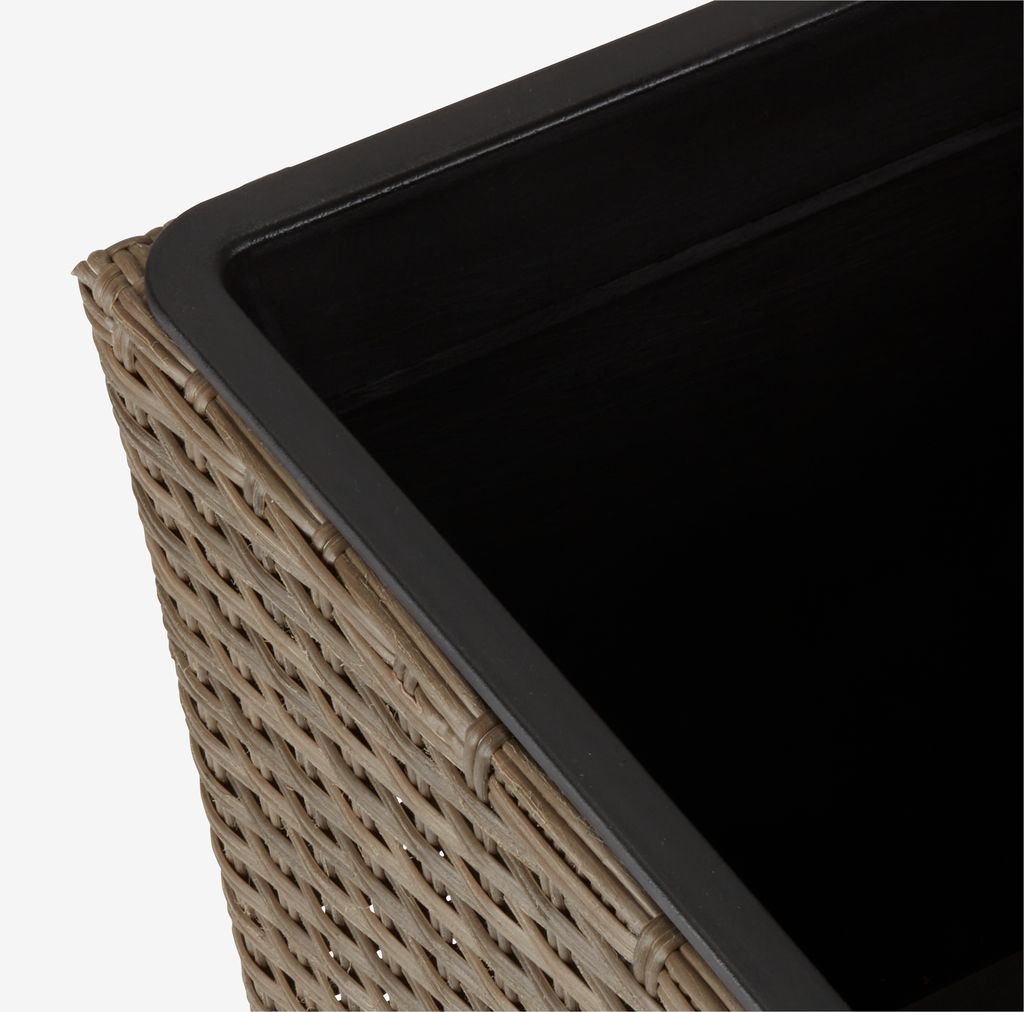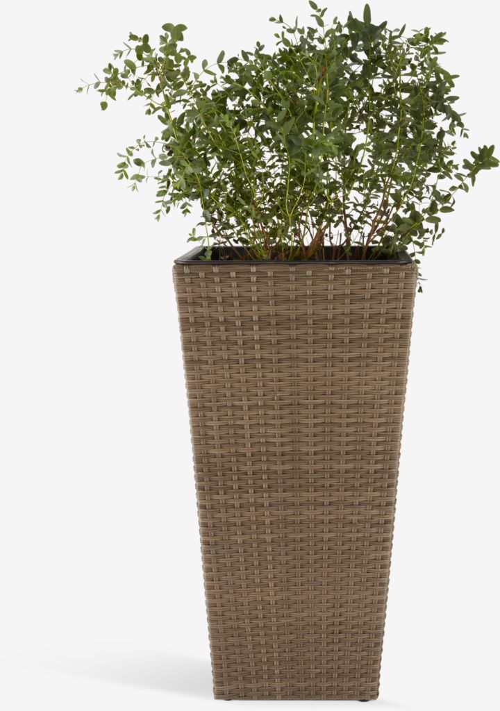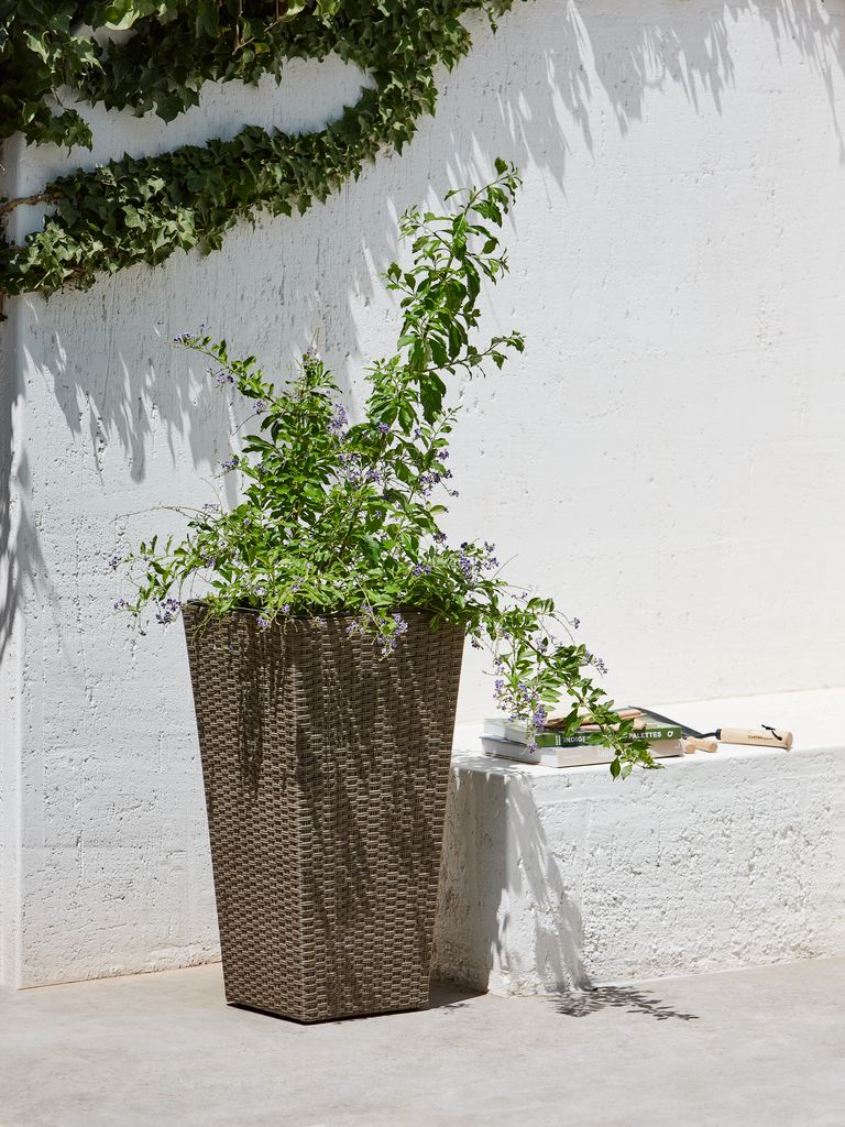 Plantenbak in polyrotan en gepoedercoat staal. Deze lichte, vorstbestendige plantenbak is ideaal voor het tentoonstellen van alle soorten planten in buitenruimtes. Een afvoergat kan eenvoudig worden gemaakt om ervoor te zorgen dat overtollig water kan wegstromen. B36 x L36 x H70 cm