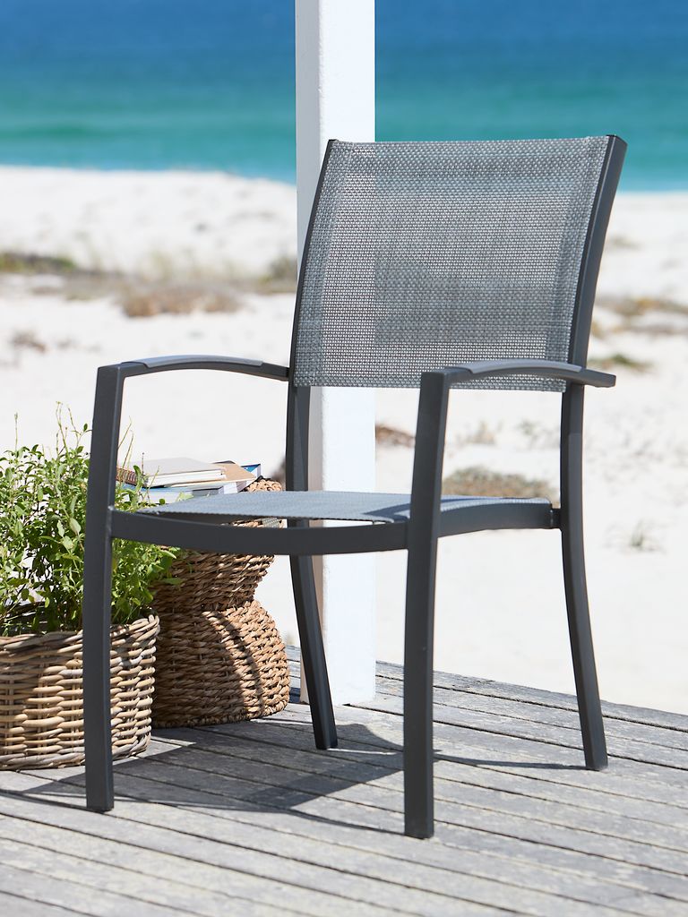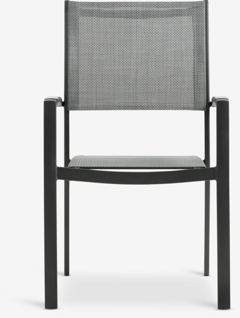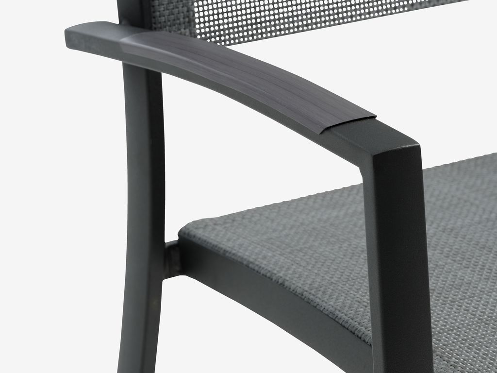 Stapelstoel met zitting en rugleuning in textileen en een frame in gepoedercoat aluminium. Textileen is een comfortabel, kleurecht materiaal dat snel droogt en gemakkelijk schoon te maken is. Aluminium is een lichtgewicht en robuust materiaal dat niet roest. De tuinstoel is stapelbaar en compact op te bergen.