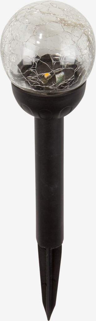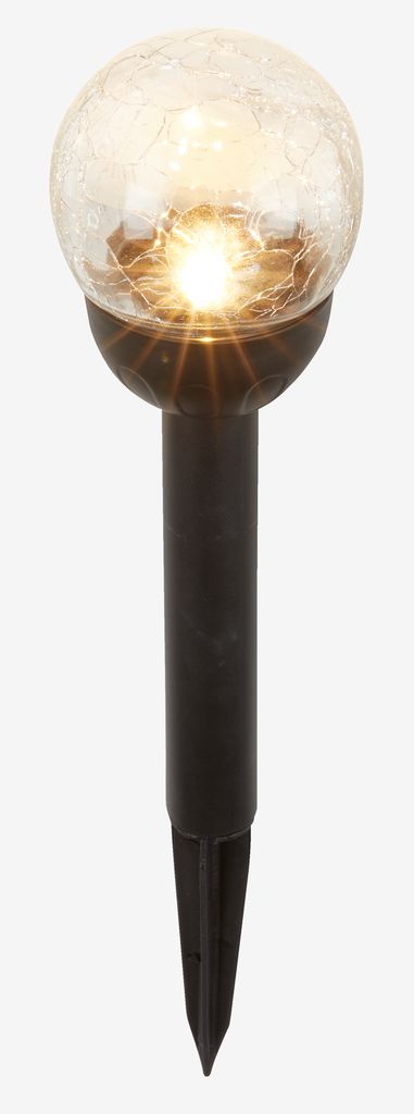 Zwarte solarlamp met een glazen bol in een gebarsten design. De LED-lamp gaat aan bij schemering en biedt 6-8 uur verlichting. De lamp wordt op een speer geplaatst zodat je hem gemakkelijk in de grond kunt zetten. Ø8 x H35 cm