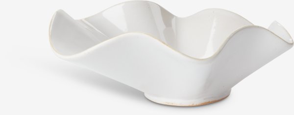 Decoratieve schaal met een golvende, sculpturale vorm in wit aardewerk. Ideaal als vrijstaand pronkstuk of voor het bewaren van kleine voorwerpen zoals sleutels. De schaal is vaatwasserbestendig voor een eenvoudige reiniging. B27 x L23 x H10 cm